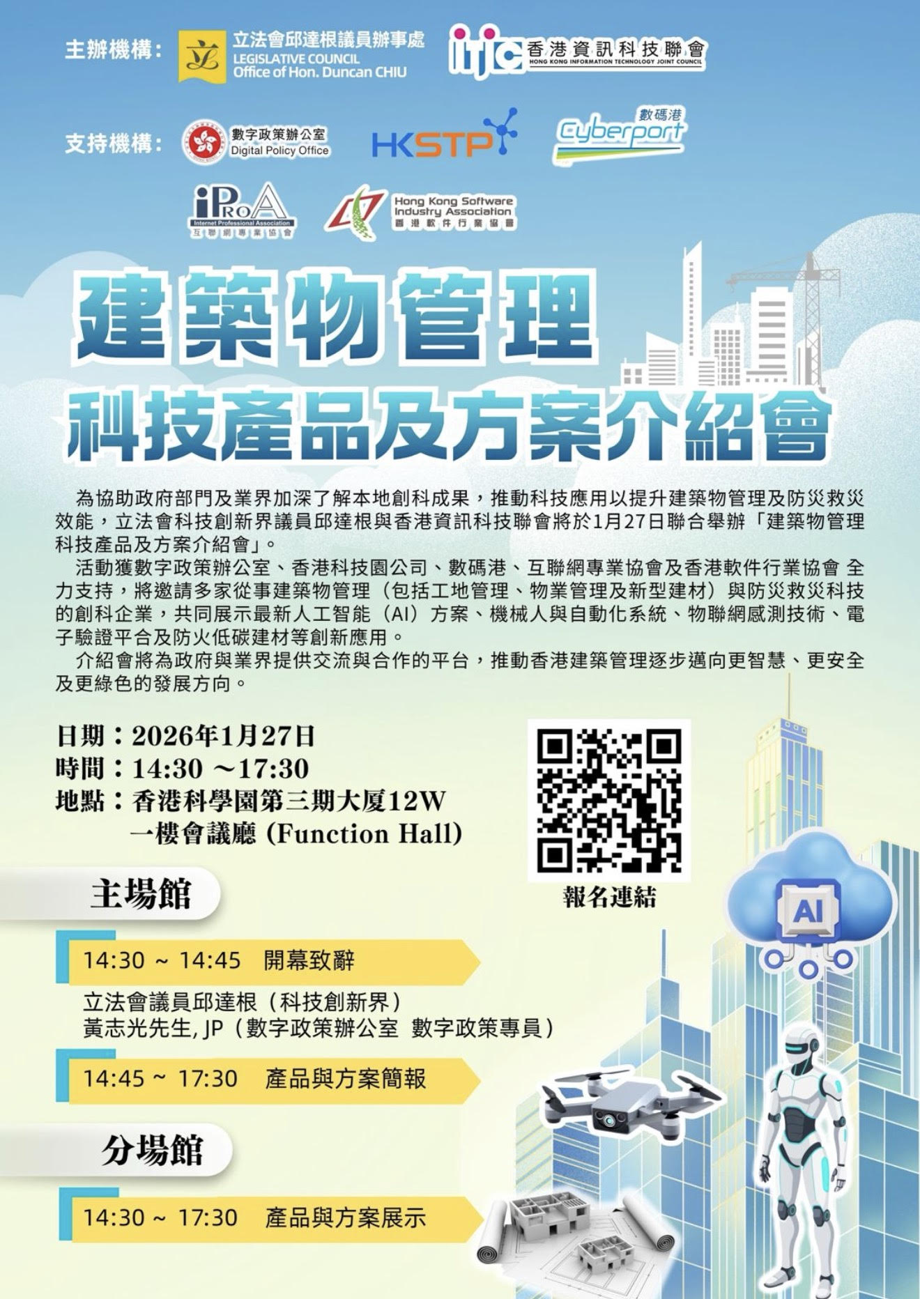 為協助政府部門及業界加深了解本地創科成果,推動科技應用以提升建築物管理及防災救災效能,立法會科技創新界議員邱達根與香港資訊科技聯會將於1月27日(星期二)聯合舉辦「建築物管理科技產品及方案介紹會」。